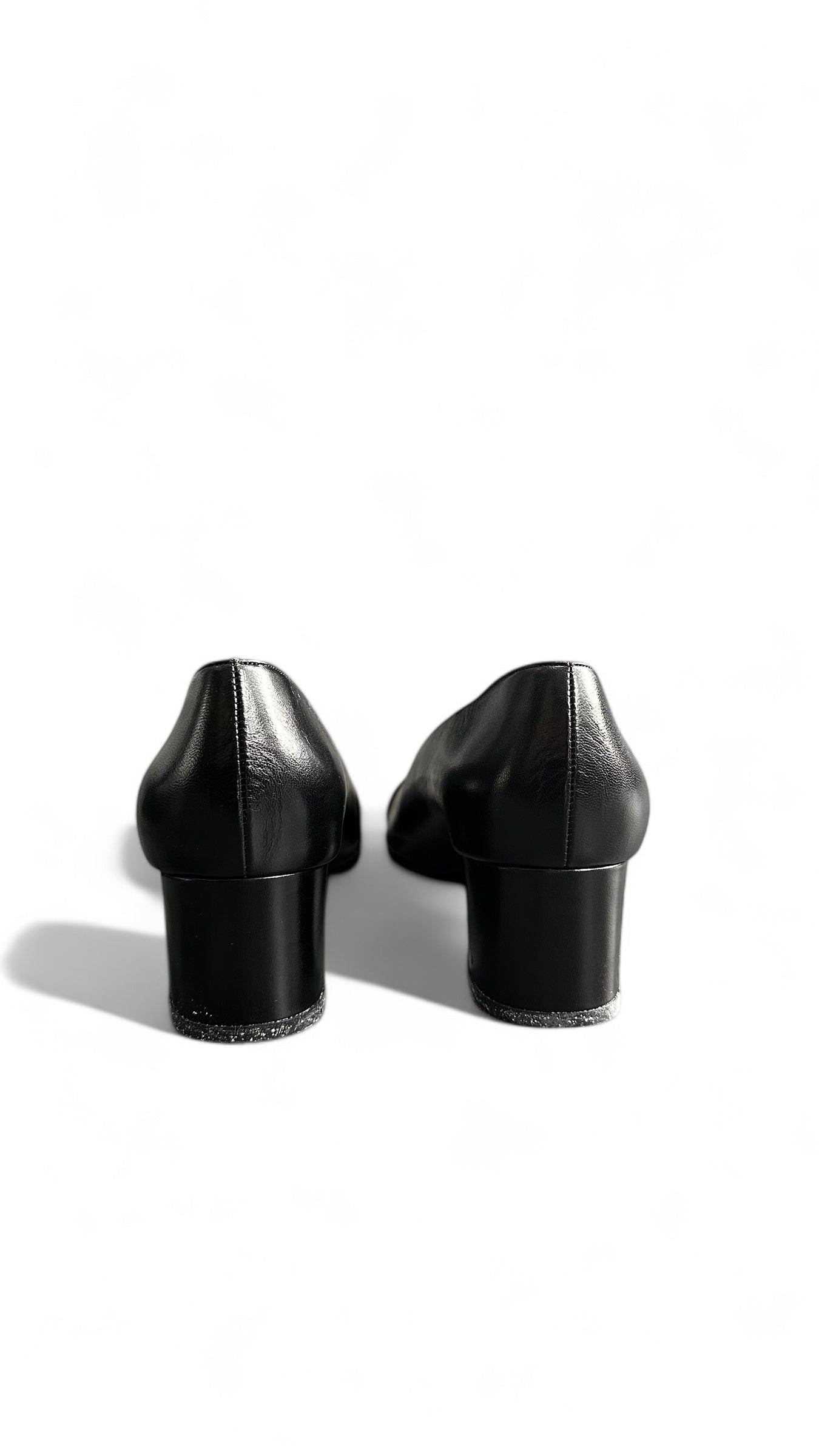 Ces ballerines à talon signées Chanel sont un modèle vintage rare et raffiné. Leur silhouette classique est relevée par un contraste de matières qui leur apporte une touche d’élégance discrète. Idéales pour un look chic au quotidien.