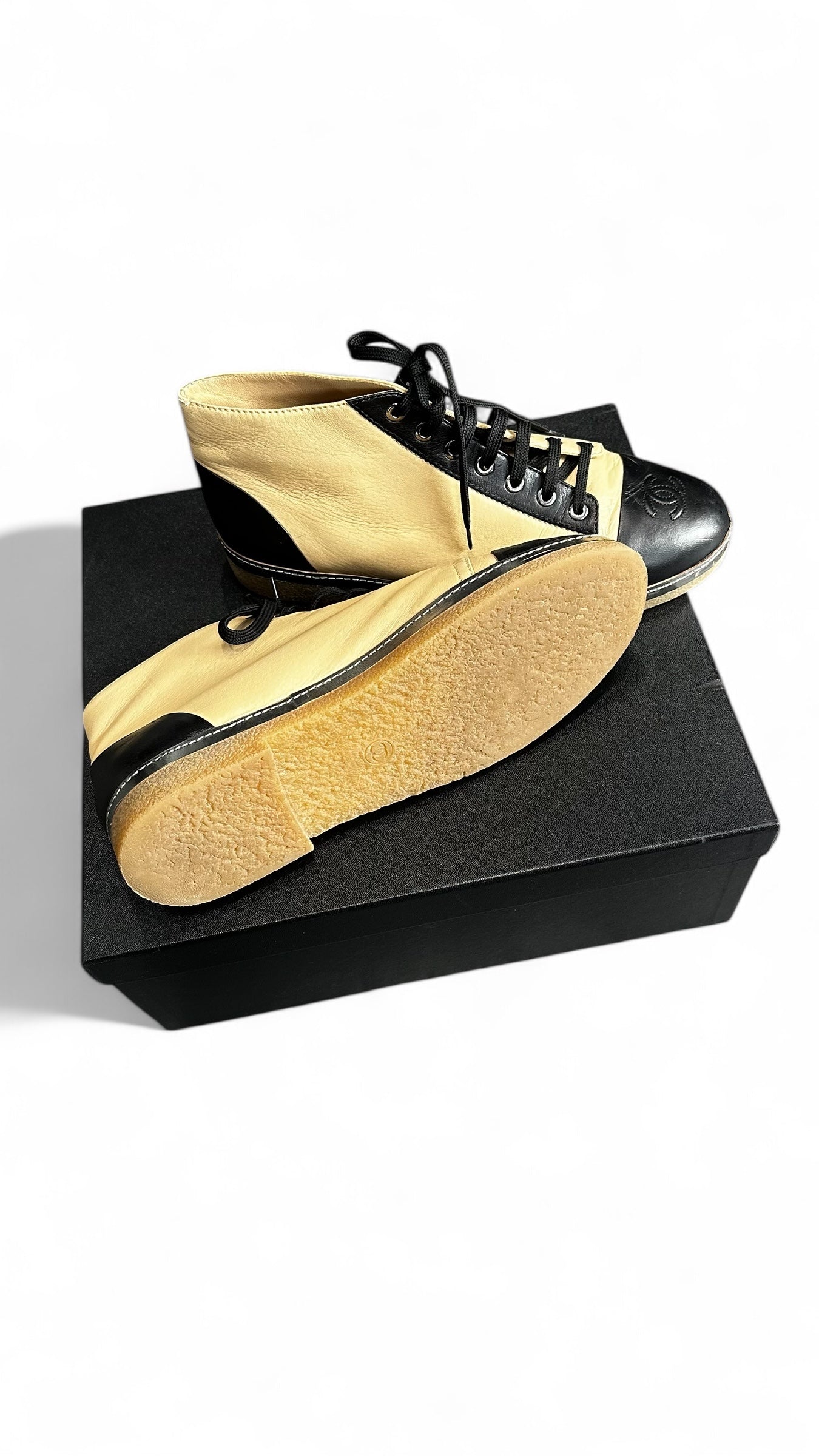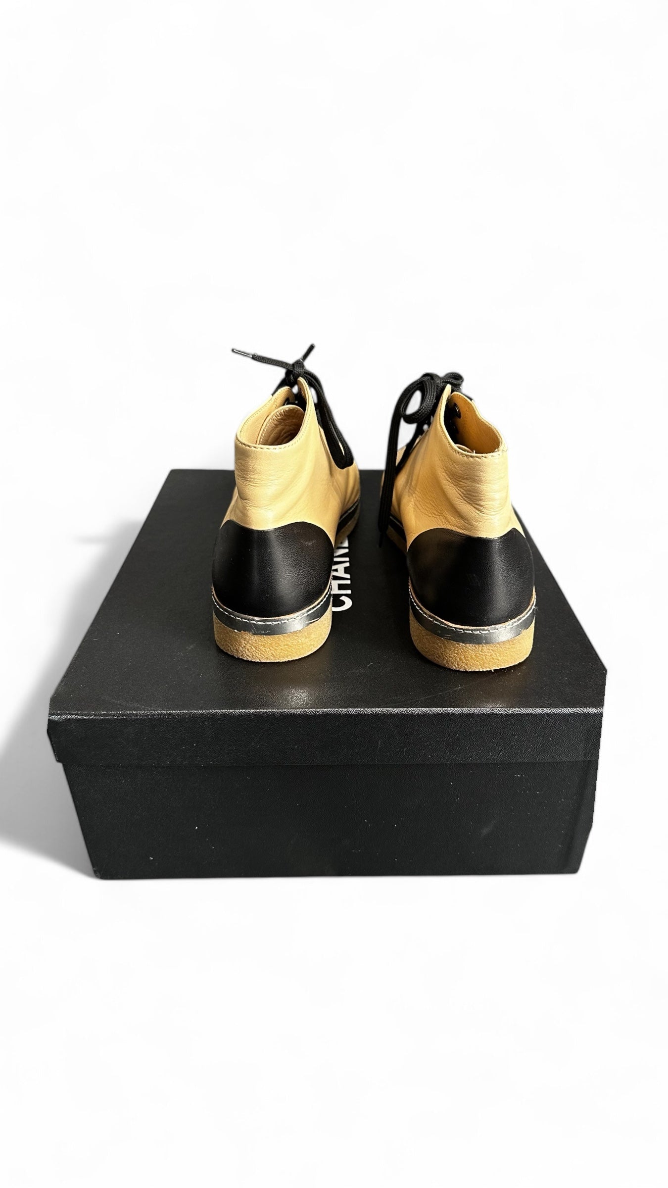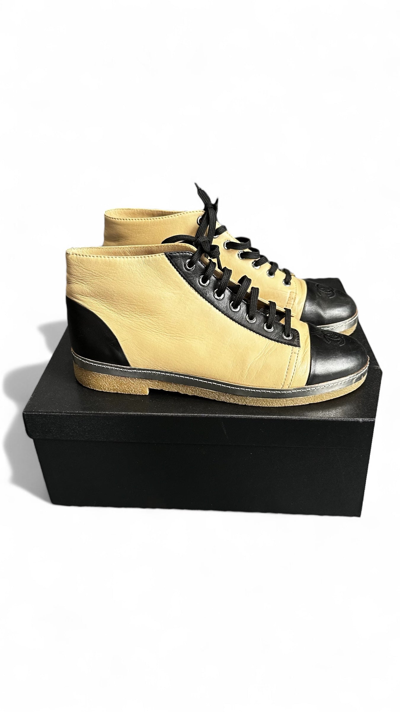 Bottine montantes élégantes signées Chanel, parfaites pour un look casual-chic. Ce modèle incarne le style emblématique de la maison avec sa silhouette raffinée et son logo reconnaissable au premier coup d’œil.