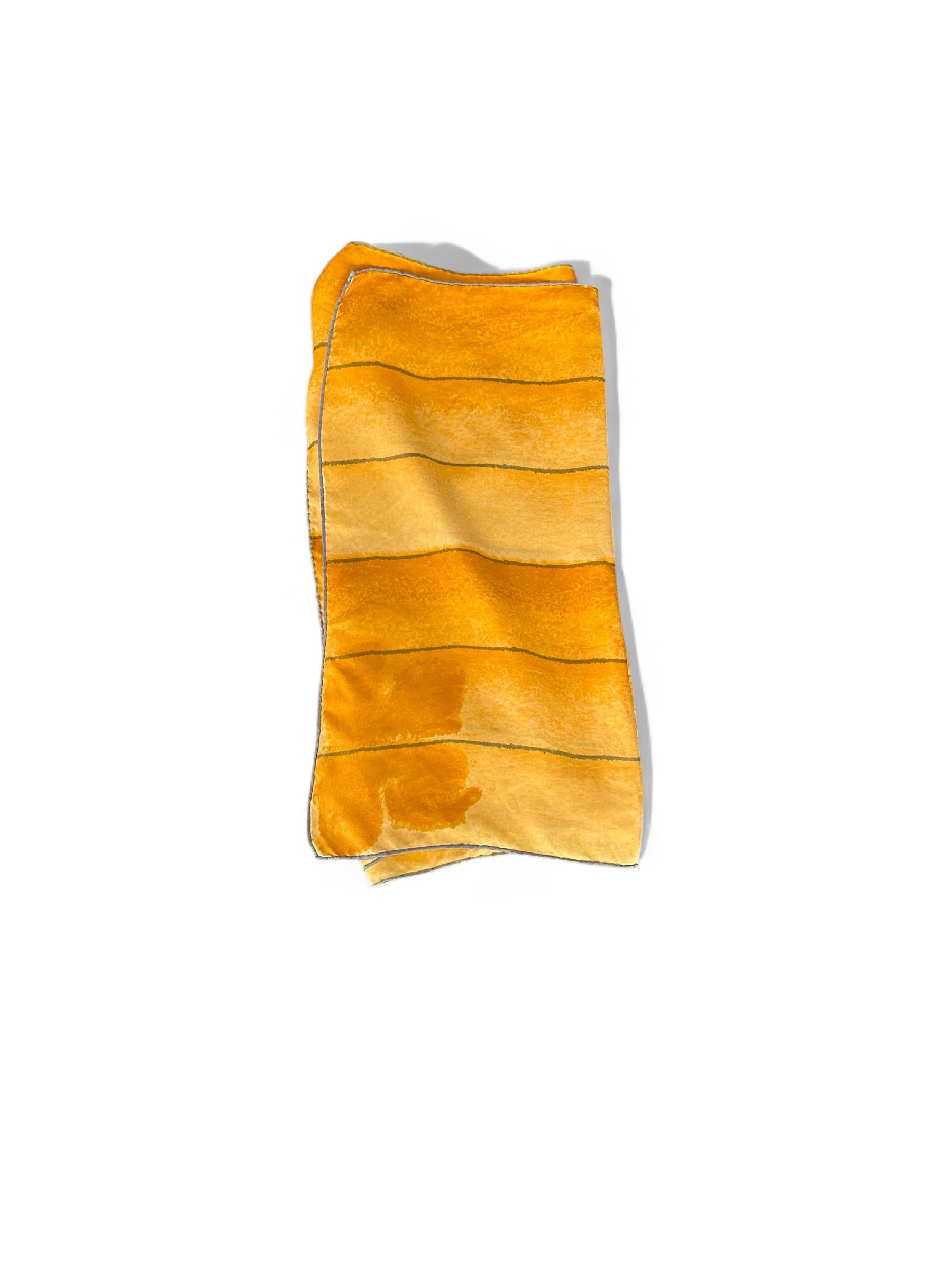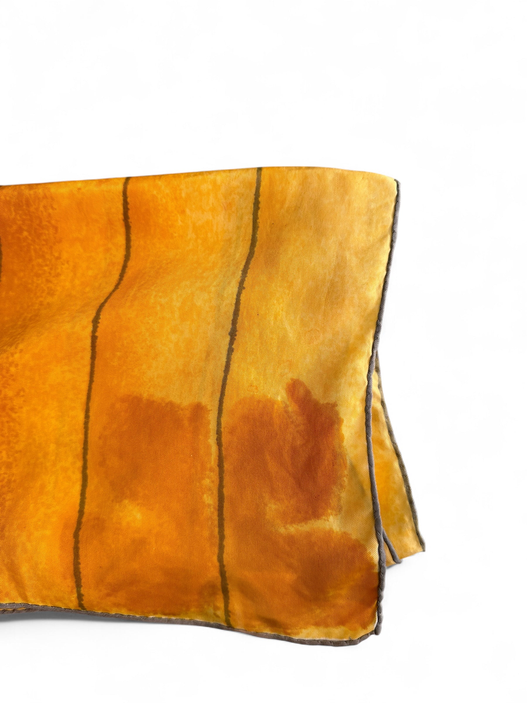 Plongez dans l’esprit graphique et audacieux de la maison Courrèges avec ce carré de soie vintage, probablement des années 70. dans un magnifique tie et die de ocre et orange, ce foulard incarne parfaitement l’esthétique futuriste et colorée de la marque.