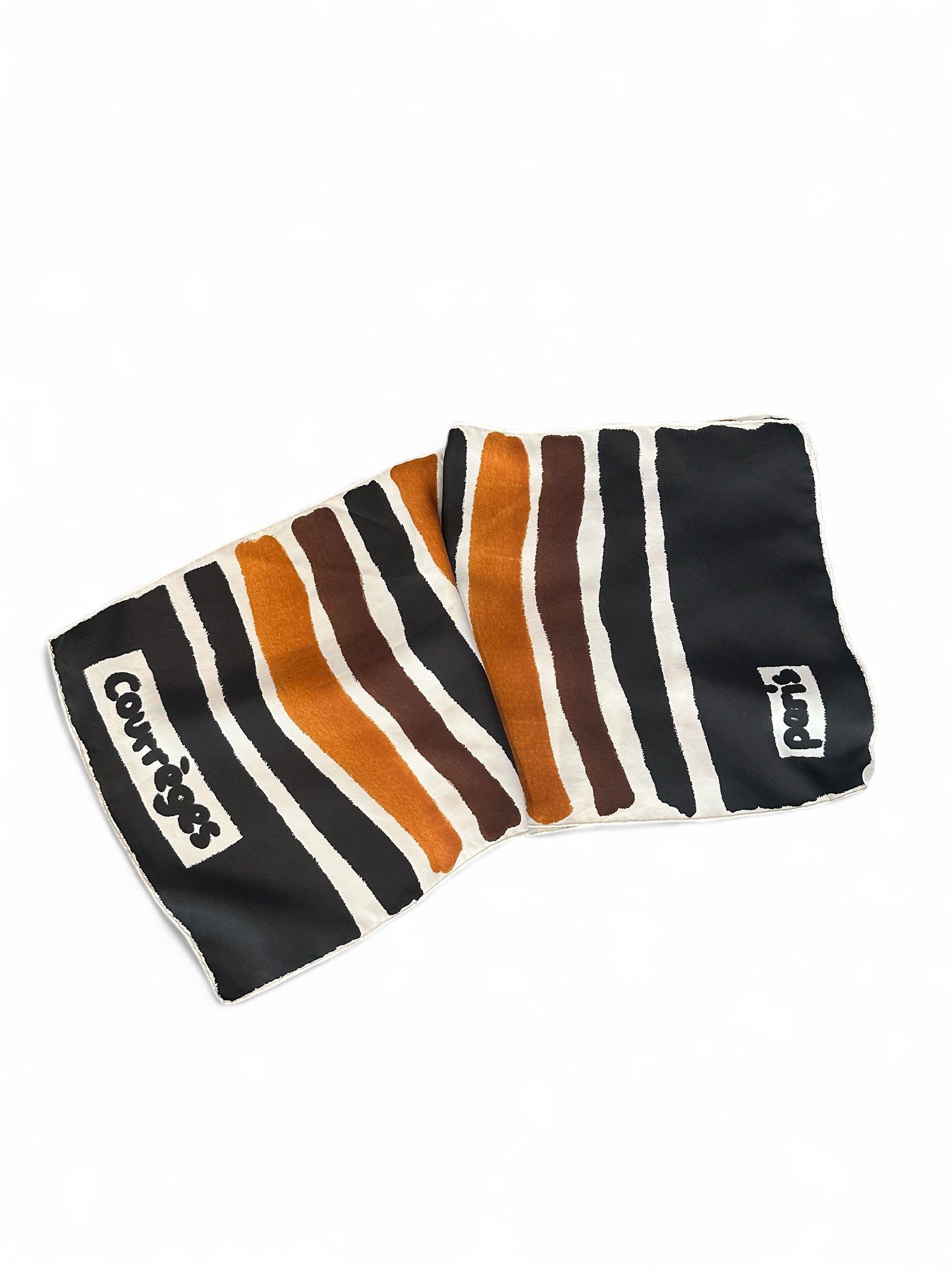 Découvrez l’essence graphique et avant-gardiste de Courrèges à travers ce carré de soie vintage, vraisemblablement des années 70. Arborant un motif rayé en noir, blanc, marron et caramel, ce foulard illustre avec finesse l’esthétique futuriste et vibrante propre à la maison.