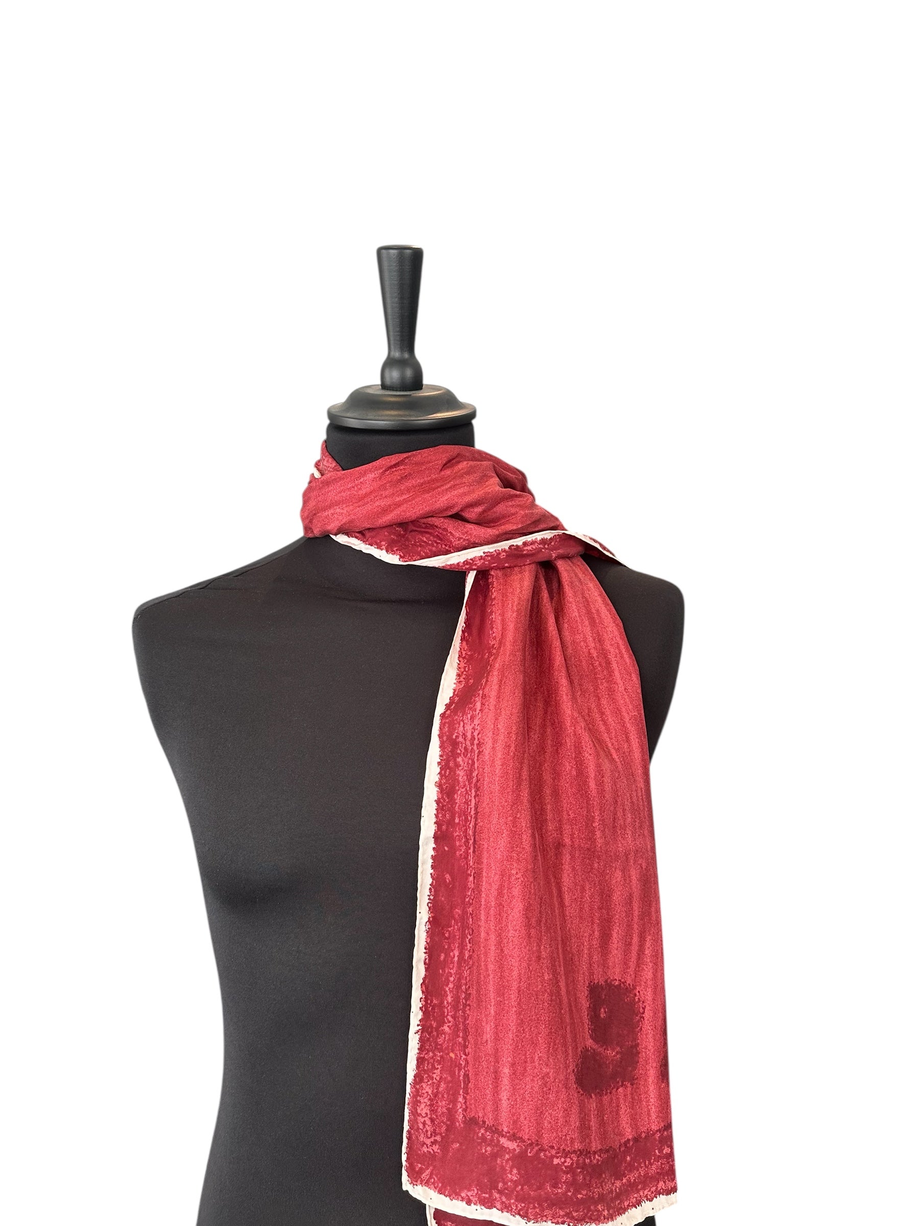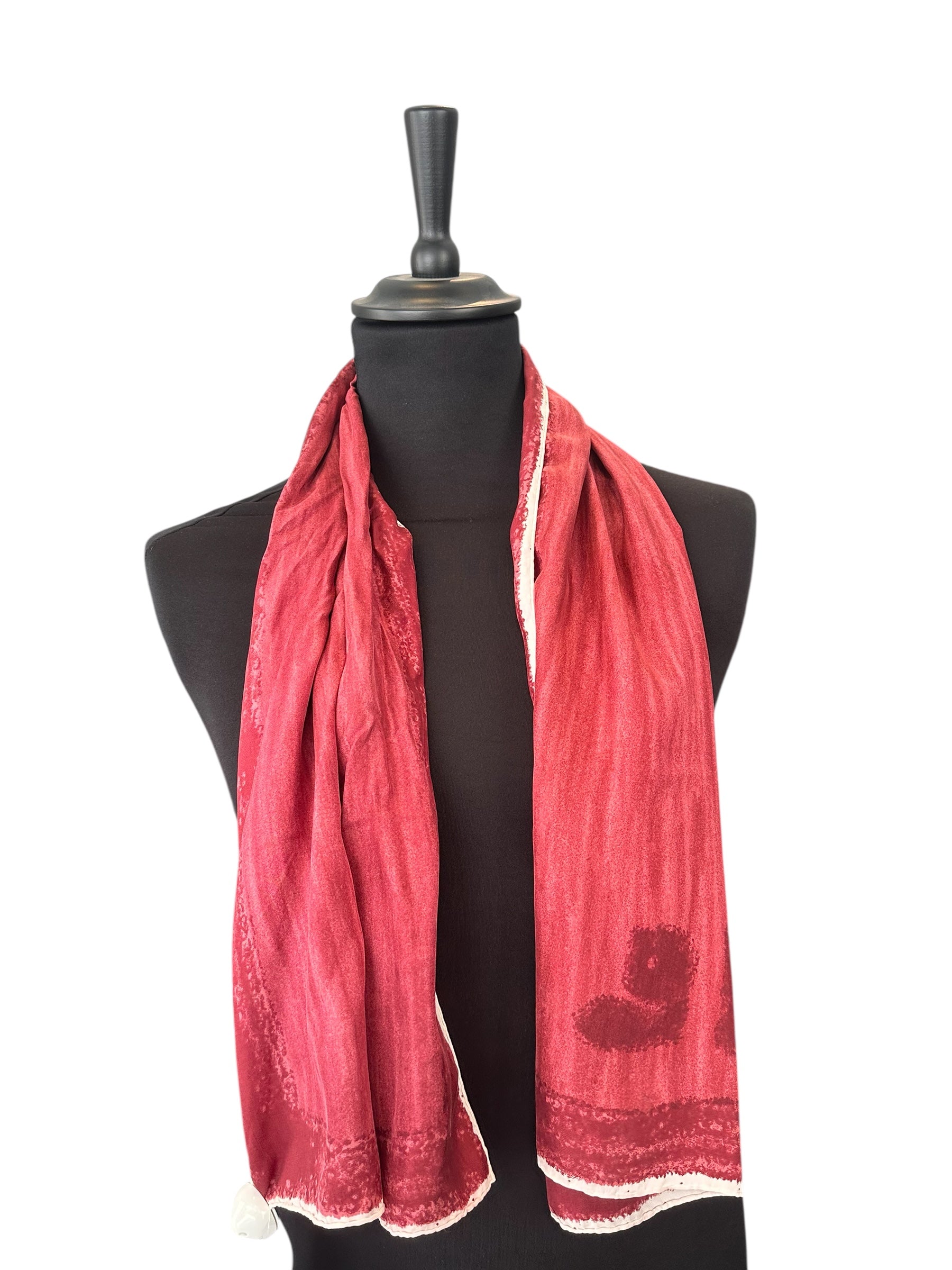 Découvrez l’essence graphique et avant-gardiste de Courrèges à travers ce carré de soie vintage, vraisemblablement des années 70. Arborant un tie and dye en bordeaux et rouge, rehaussé d’un élégant liseré blanc éclatant, ce foulard reflète avec justesse l’esthétique futuriste et vibrante propre à la maison.