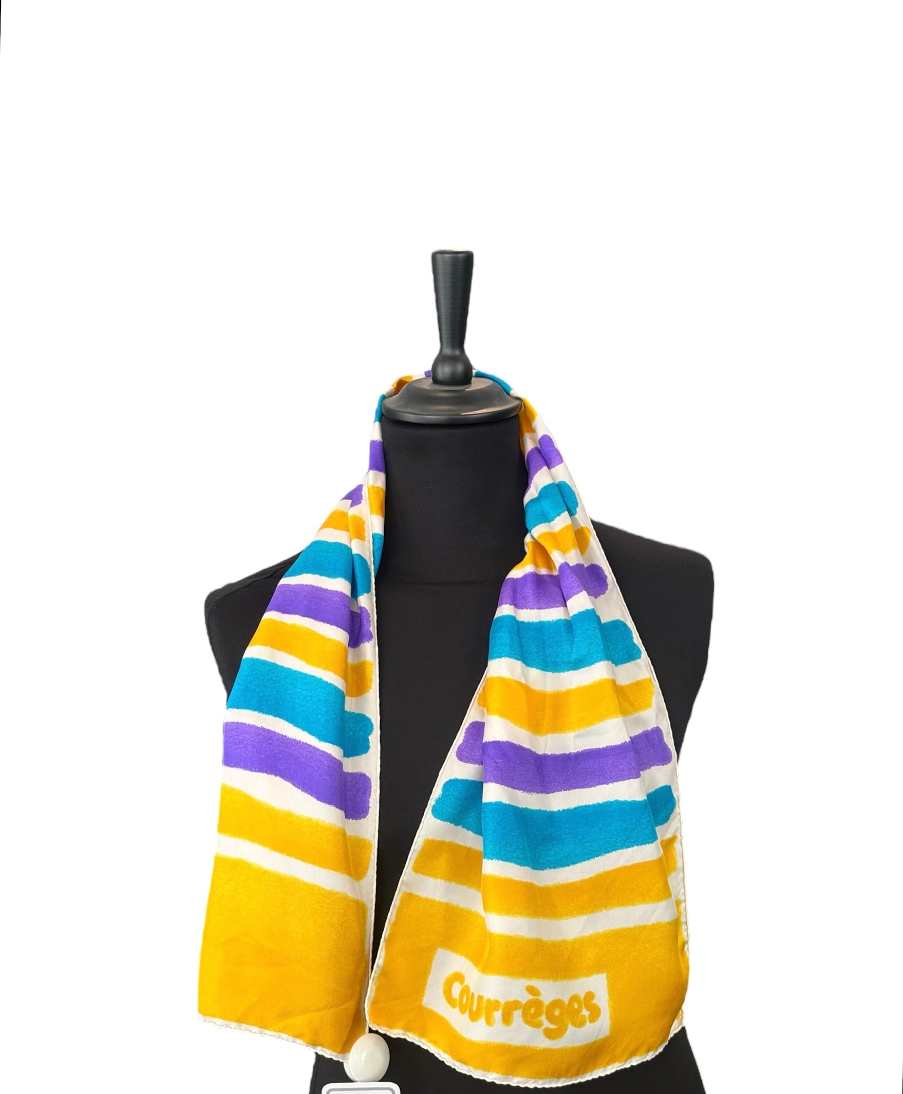 Plongez dans l’esprit graphique et audacieux de la maison Courrèges avec ce carré de soie vintage, probablement des années 70. Orné de vagues jaune, violette et bleu turquoise, ce foulard incarne parfaitement l’esthétique futuriste et colorée de la marque.