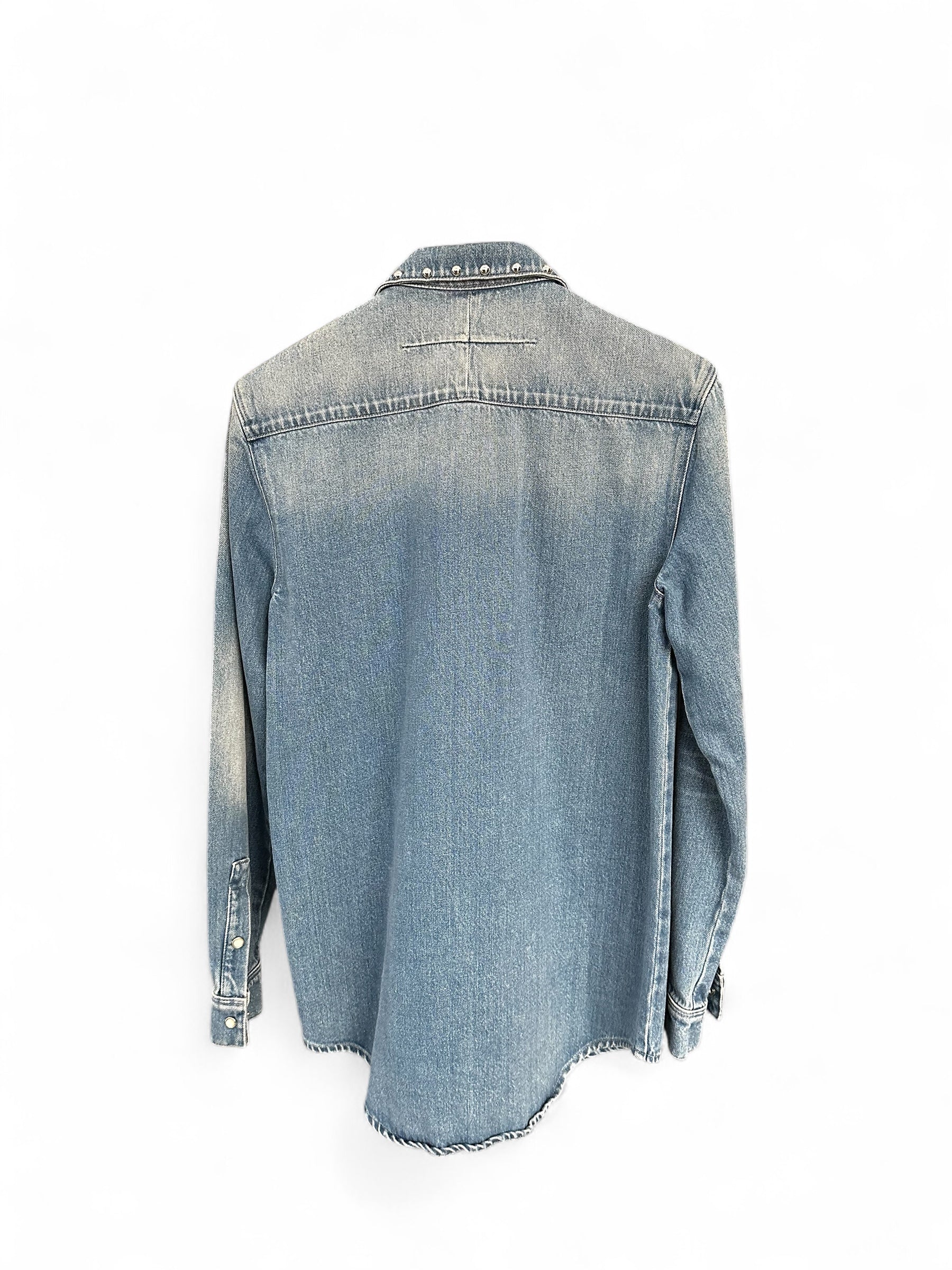 Icône du vestiaire urbain revisité par la Maison Givenchy, cette chemise en jean se démarque par ses détails cloutés au niveau des épaules et des poches. Fabriquée en 100 % coton, elle allie confort, caractère et sophistication rock. Une pièce forte à associer aussi bien avec un pantalon tailleur qu’un denim brut pour un look affirmé.