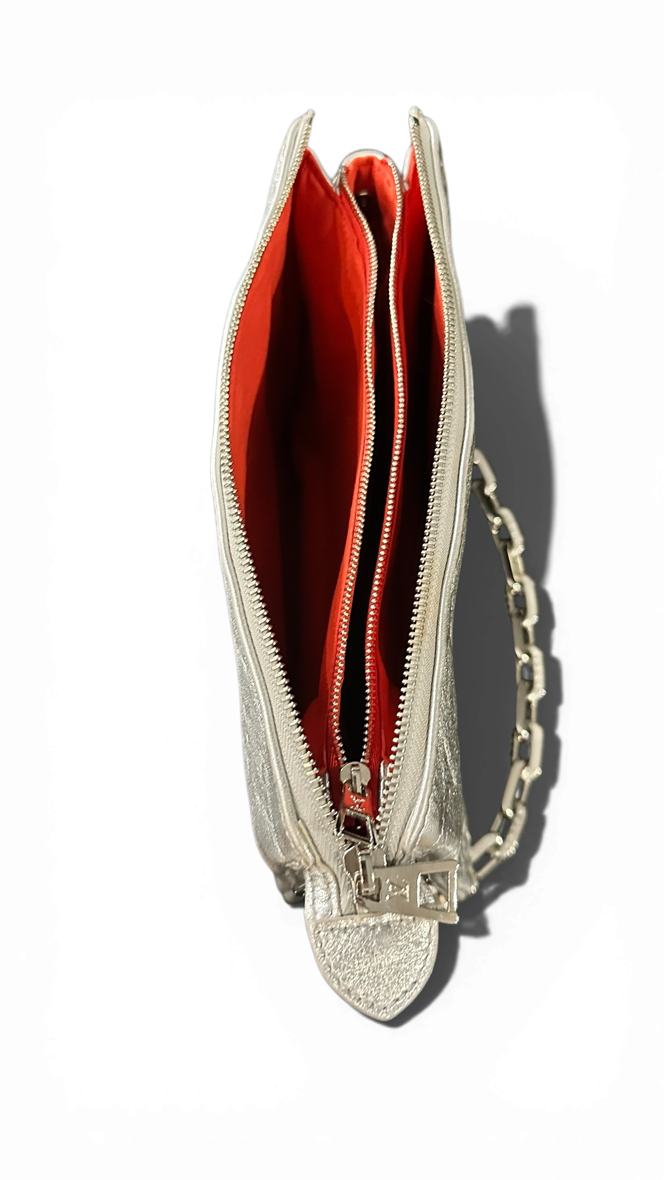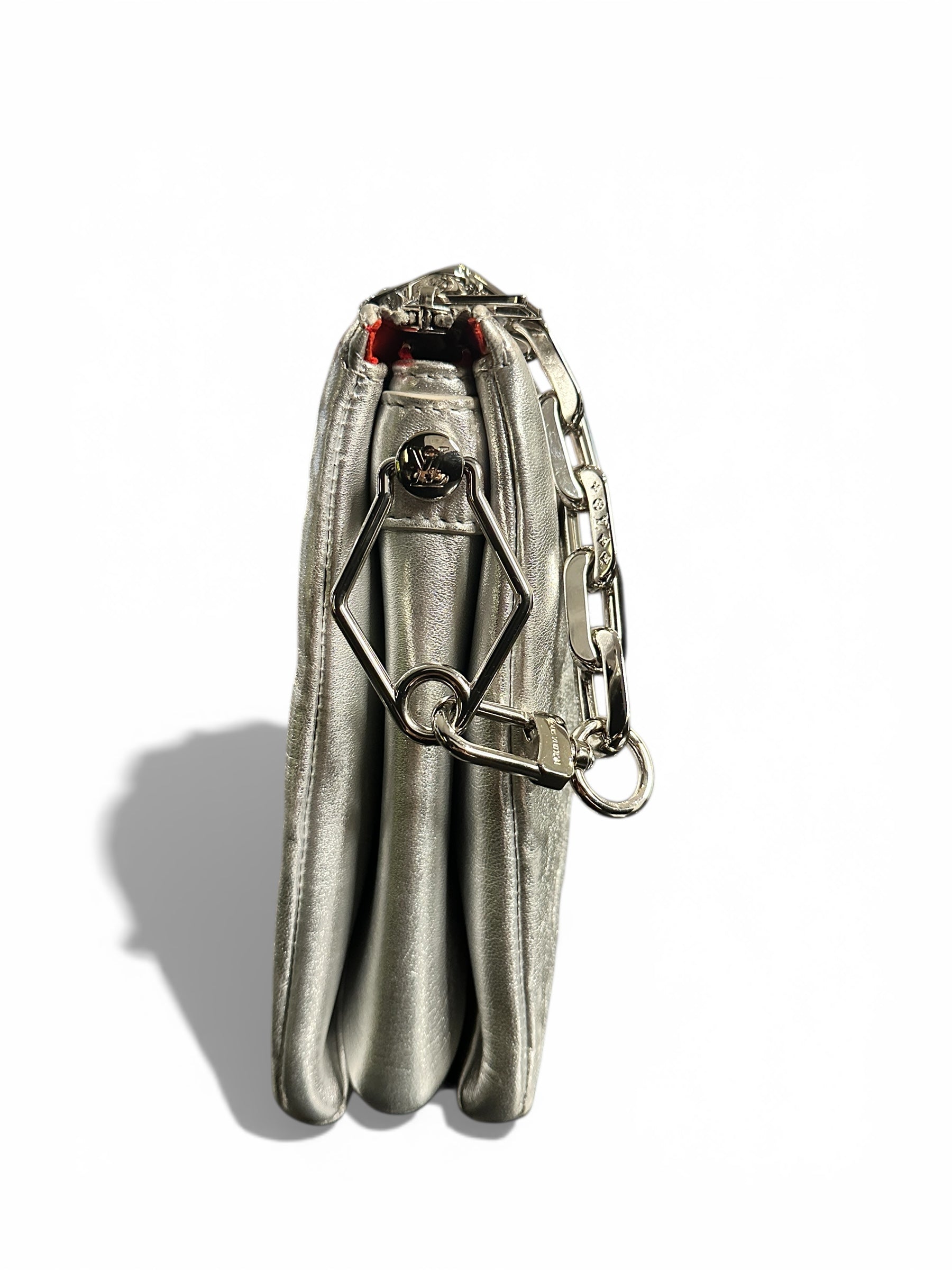 Le modèle est complété par une chaîne amovible en métal argenté, permettant un porté épaule courte ou main, et une fermeture zippée sur le dessus. L’intérieur est doublé d’un cuir suédé rouge, détail signature qui contraste subtilement avec l’extérieur argenté.