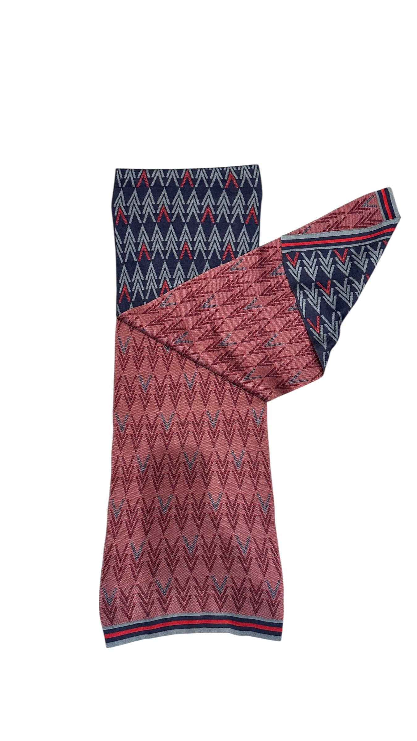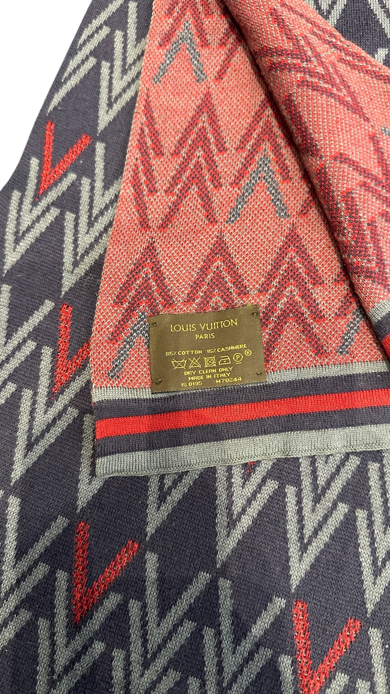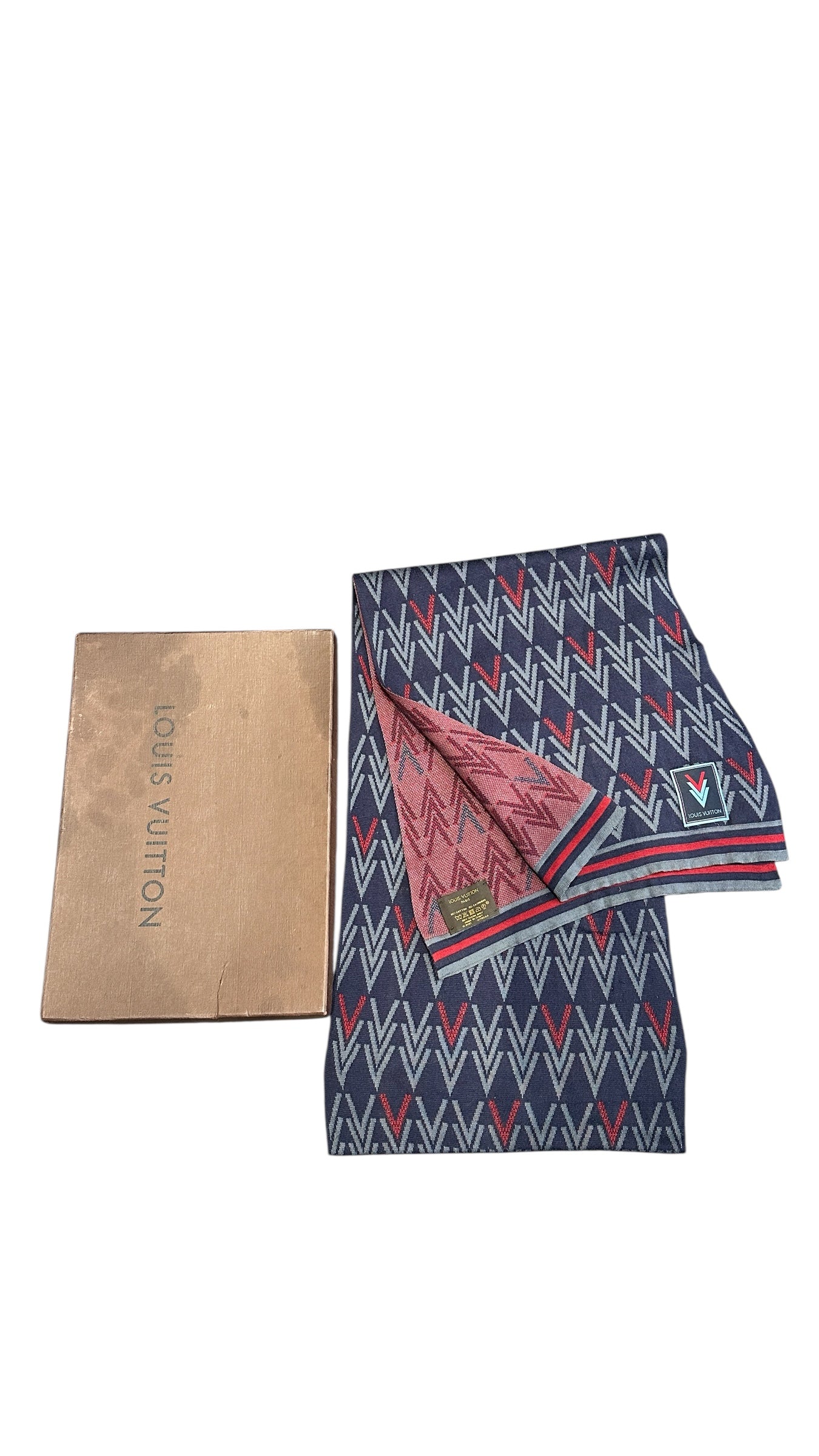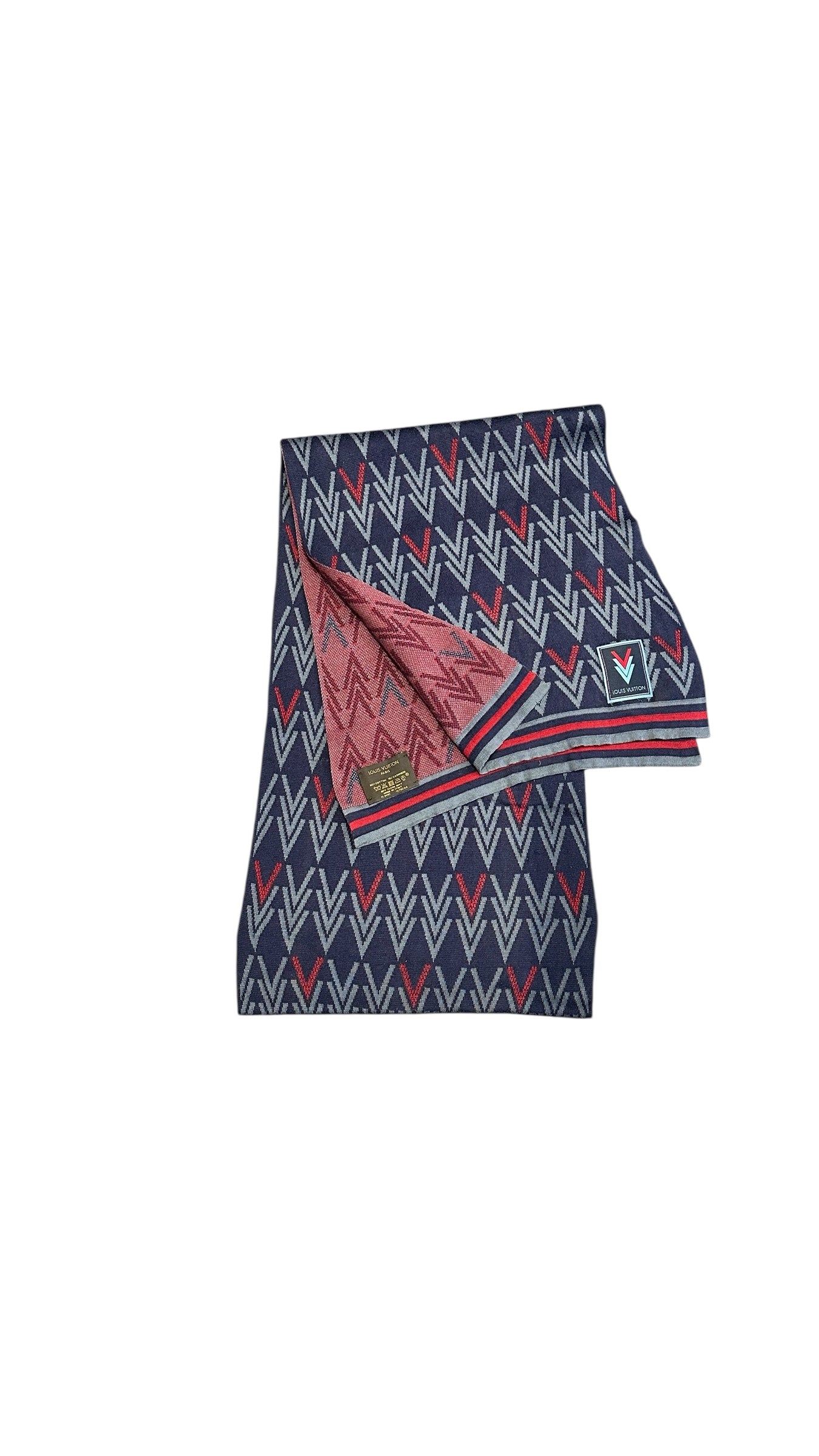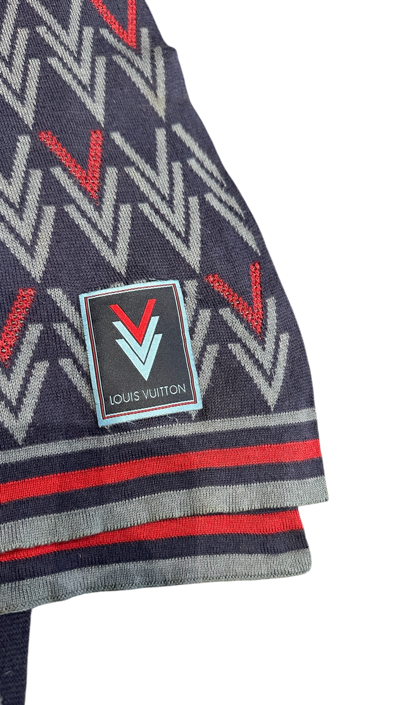 Écharpe Louis Vuitton en mélange laine et soie, revisitée dans une version graphique contemporaine autour d’un motif Monogram stylisé en chevrons.