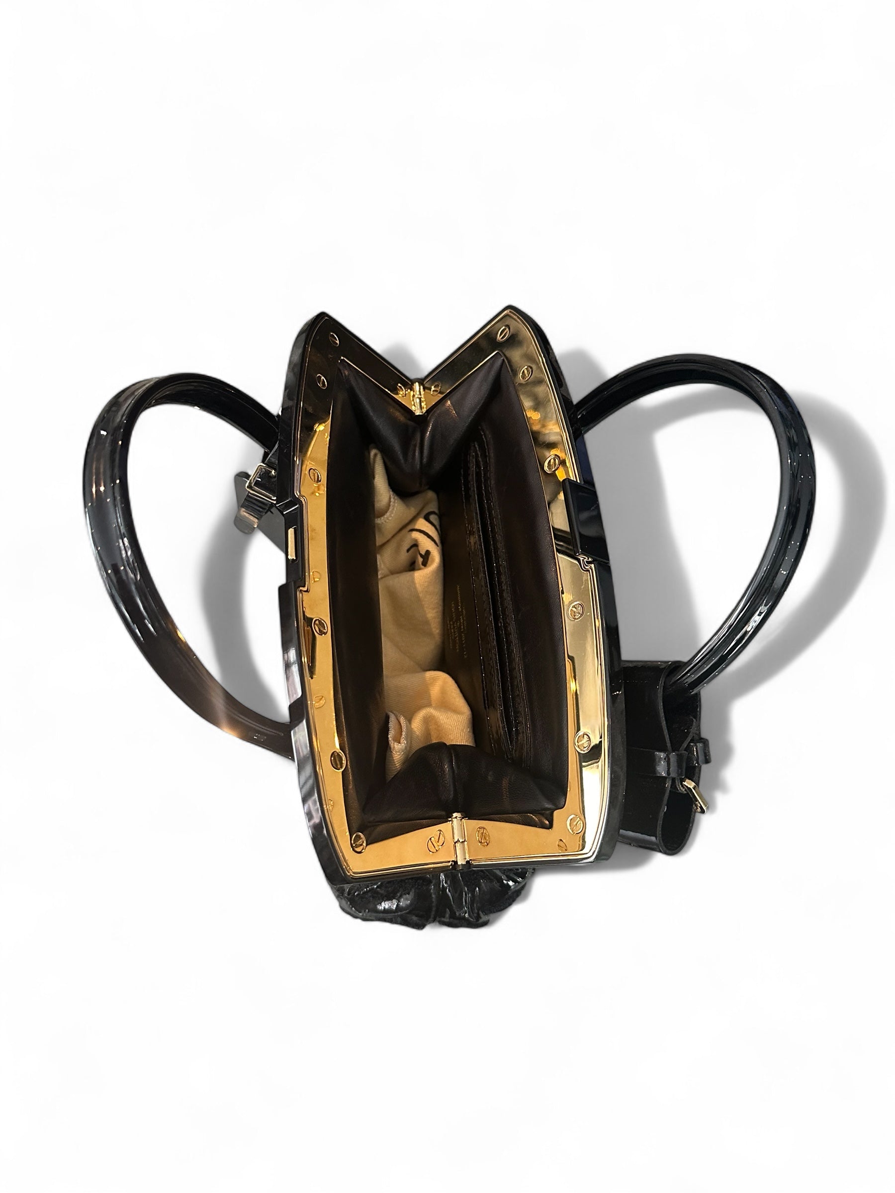 Confectionné en cuir vernis noir intense, ce modèle compact séduit par son élégance structurée et son éclat sophistiqué. Il est proposé ici en parfait état, livré avec son dustbag d’origine.