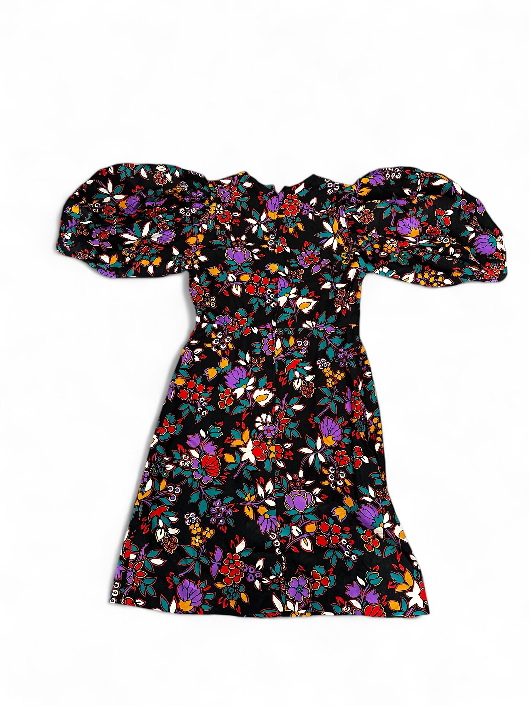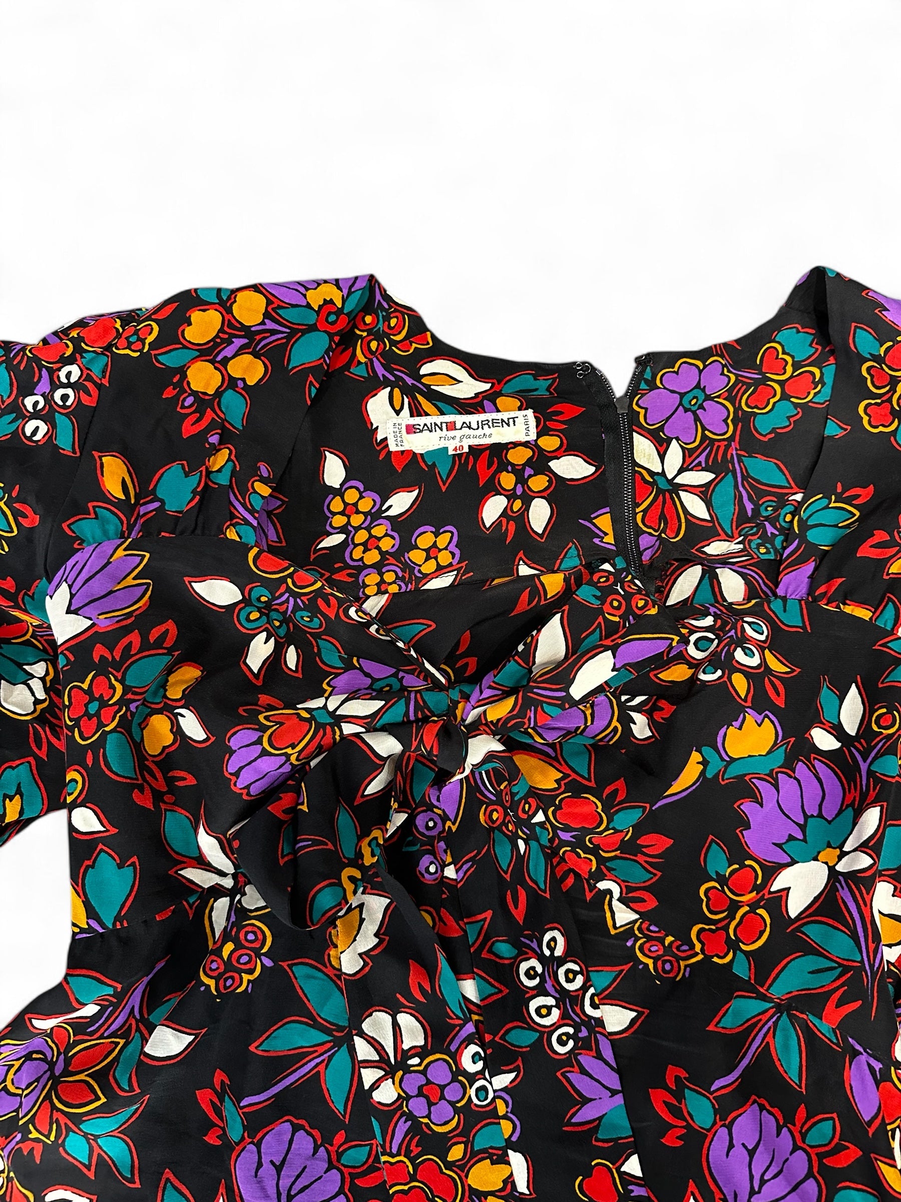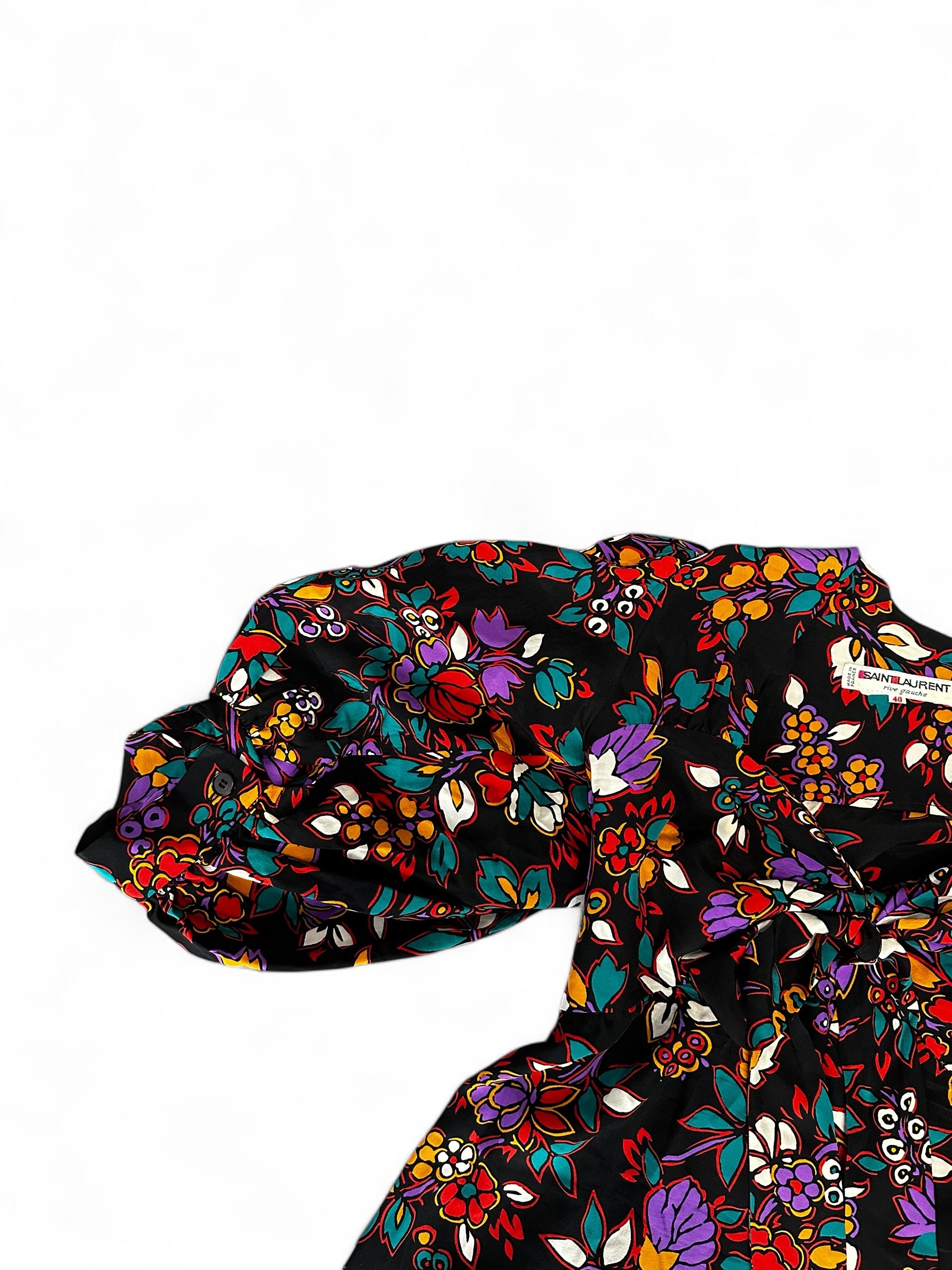 Élégante et audacieuse, cette robe vintage Yves Saint Laurent – ligne Rive Gauche incarne l’esprit créatif et libre de la Maison. Fabriquée en France, elle se distingue par son imprimé floral multicolore sur fond noir et ses manches ballon spectaculaires, signature d’une féminité affirmée. Une pièce rare au charme intemporel, idéale pour une allure sophistiquée avec une touche artistique.