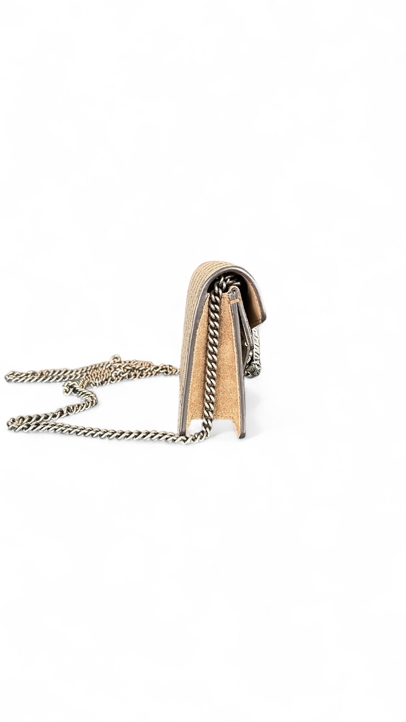 L’iconique sac Dionysus de Gucci, ici en format mini, allie l’élégance intemporelle de la maison italienne à une silhouette compacte et structurée. Son fermoir signature à double tête de tigre, inspiré de la mythologie grecque, affirme une allure à la fois audacieuse et sophistiquée.